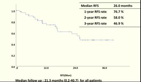 该项研究结果显示,患者1年RFSR和中位RFS分别为76.7%和26.0个月(图4),接受SR和RFA之间无差异。探索性生物标志物分析结果显示,WNT/b-连环蛋白相关基因(APC, CTNNB1, TCF7L1, TCF7L2)拷贝数增加(CNGs)与较短的RFS相关(阳性:11.8个月vs阴性:未达到[NR];P=0.0003)。免疫组化显示PD-1阴性(P< 0.0001)、PD-L1联合阳性评分较低(P= 0.0113)、CD8+肿瘤浸润淋巴细胞(TILs)数量较低(P= 0.0130)、Foxp3+细胞阳性(P= 0.0076)与复发相关。使用纳武利尤单抗前ctDNA阳性患者(n=10)的RFS往往比ctDNA阴性患者更短(26.2 vs. NR);TMB与RFS无相关性。在安全性方面,3~4级治疗相关不良反应发生率为18.9%,与免疫相关的AEs占25%。