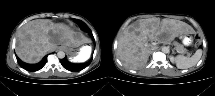 腹部CT检查(2020年11月10日):贲门胃底占位,肝内多发转移灶,腹主动脉旁多发淋巴结肿大,见图1。