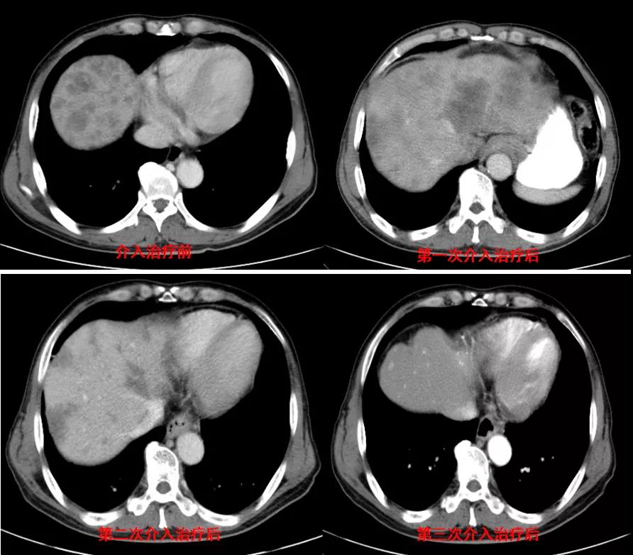 讨论:患者病灶进一步减小,病情控制好,治疗疗效显著且肝转移病灶大于3个,因此不建议行射频消融治疗,建议继续行介入联合靶向治疗。