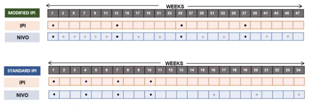 在联合NIVO时,每12周IPI给药方案(相较于每3周IPI给药方案),可显著降低G3/4 TRAE发生率。结局数据表明,经改了治疗方案并没有明显降低ORR或PFS,这与之前对比舒尼替尼的研究一致。