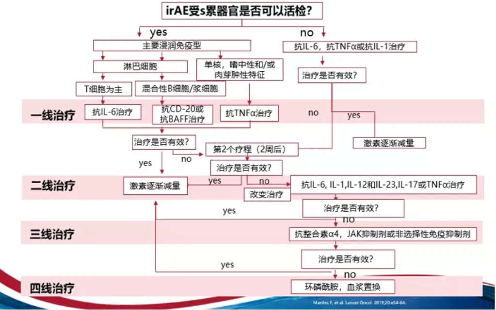 激素抵抗型的irAE尚无明确定义,通常具有三个特征:初始使用高剂量激素后因症状无改善或激素减量时症状复燃,需重新加大激素剂量,需额外加用其他免疫抑制剂(如英夫利昔单抗、麦考酚酯)和/或加大激素剂量仍不能避免患者死亡。