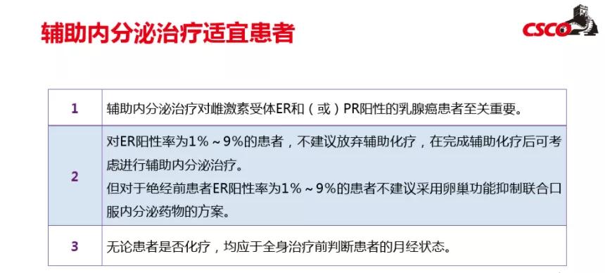 2、术后辅助内分泌治疗:当今乳腺癌的标准治疗模式为以手术为主的治疗,包括化疗、放疗、内分泌治疗及中医药治疗在内的综合治疗。内分泌治疗在综合治疗中的地位日渐提高,已成为乳腺癌主要的全身治疗手段之一。