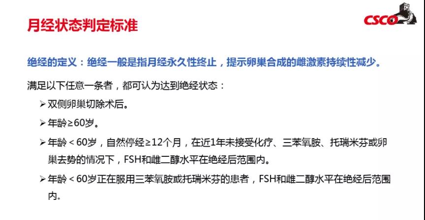 患者年龄小于60岁,化疗前未绝经,后因“右侧乳腺癌”术后化疗8疗程后绝经,因此患者不属于绝经状态(参考以下)