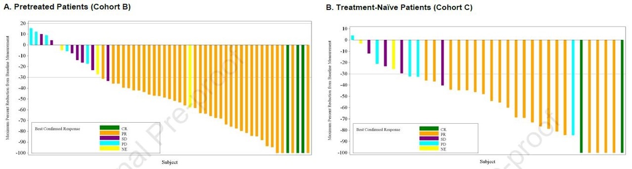 从疗效来看,两个队列均展示了较好的治疗效果,且经治患者和初治患者接受达拉非尼联合曲美替尼治疗的疗效未见显著差异。经治队列和初治队列的ORR分别为68.4%和63.9%,分别有5%和6%的患者评估为CR,63%和58%的患者评估为PR,DCR率分别为80.7%和75%。两组分别有71.9%和75%的患者瘤体出现不同程度缩小,体现了这一治疗策略的抗肿瘤活性。中位DOR分别为9.8个月和10.2个月,说明客观响应可以持续。