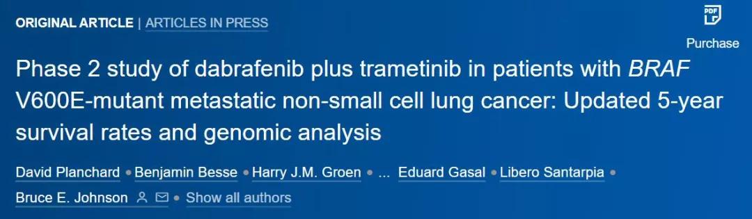 1%-5%的晚期NSCLC患者携带BRAFV600E突变,既往一项单中心、多队列的临床研究发现,给予BRAFV600E抑制剂达拉非尼可以给患者带来获益,但ORR仅为33%,中位PFS仅为5.0个月左右,在此基础上进一步联合曲美替尼可以给患者带来进一步获益,首次数据公布时,中位PFS约为10.0个月,但OS数据尚不成熟。近期,JTO杂志发表了该研究随访5年后的数据。