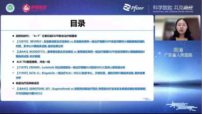 广东省人民医院周清教授汇报了“肺癌领域治疗新进展”。周教授提到中国的CTONG 1509和日本的NEJ026研究已经显示了“A+T”在亚裔人群中可获得卓越的疗效,2021 ESMO报告的是意大利的BEVERLY研究,该研究显示了“A+T”模式在非亚裔晚期EGFR突变非鳞NSCLC中同样具有有效性。WJOG9717L研究未显示奥希替尼联合贝伐单抗较奥希替尼单药治疗EGFR突变非鳞NSCLC疗效的优越性,但是吸烟人群或EGFR 19外显子缺失突变人群或能从一线治疗中获益。CROWN研究的亚洲人群分析显示Lorlatinib一线治疗晚期ALK+NSCLC的疗效和安全性与总人群一致。ALTA-1L研究长期随访表明Brigatinib或可成为ALK+NSCLC一线治疗的新选择。GEMSTONE-301研究显示舒格利单抗较安慰剂显著延长局部晚期接受放化疗后NSCLC的PFS,安全性也可控,为舒格利单抗巩固治疗晚期NSCLC提高新证据,提示免疫治疗迎来了新成员。