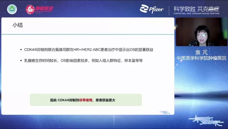 中国医学科学院肿瘤医院袁芃教授做了“步步为营,稳扎稳打 CDK4/6抑制剂MBC进展”的报告,介绍了内分泌治疗领域延长OS的又一个突破---MONALEEA-2研究。并提出CDK4/6i尽早使用者的获益会更大。在CDK4/6i在HR+/HER2+乳腺癌中应用环节,袁芃教授提到了PATRICIA研究、MonarchER等研究。最后总结指出三种CDK4/6i联合AI优于AI单药,整体人群疗效没有差异,CDK4/6i治疗三阳性乳腺癌也值得深入研究。