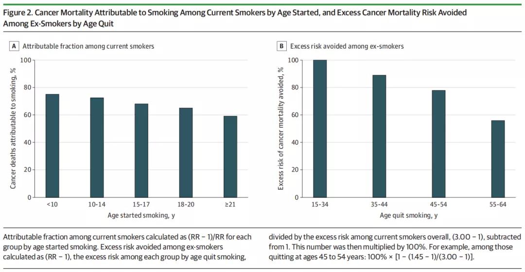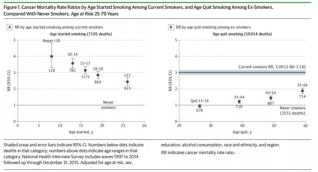 在当代美国人口中,吸烟与癌症死亡率的关系是从不吸烟患者的3倍。虽然延迟开始吸烟年龄与癌症死亡风险的大幅降低有关,但那些在21岁及以后开始吸烟的人的风险是不吸烟者的两倍以上。即使是在年纪较大的时候戒烟,也与这些风险的大幅度逆转有关。