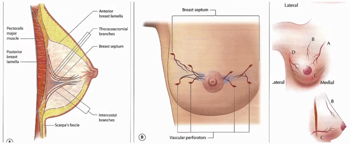 保乳整形手术在操作上较单纯乳腺肿物切除更加复杂,术者需充分了解乳头血供及神经支配情况(见图3);乳腺密度也是手术时应考量的因素,密度较大的乳腺组织血液灌注更好,也能支撑手术缝线,而脂肪密度较大的乳房整形手术往往范围更大、操作更难;乳房下垂的程度也对手术预期结果有一定影响。