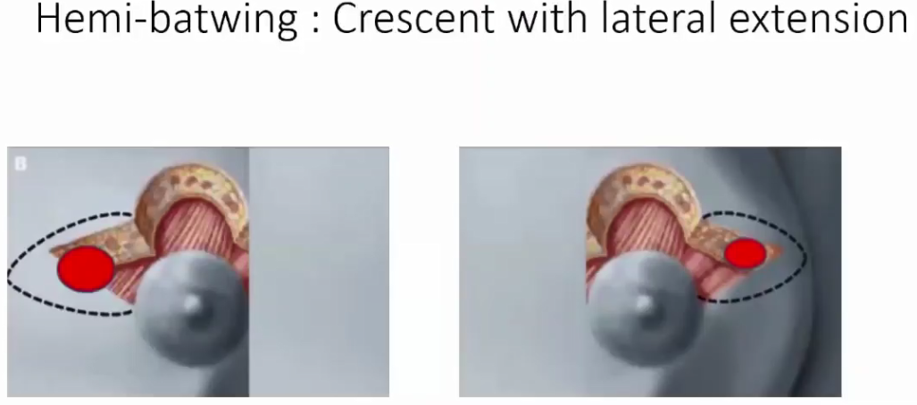对临近乳头位置的肿物,可考虑行新月形皮肤皮下组织缝合(Crescent mastopexy),从而上提乳头乳晕的操作(见图4),从而更好地暴露肿瘤组织并切除,且术后乳房整体外表美观,但有着乳头内陷、双侧乳房不对称的缺点,因此可考虑对双乳均进行上提。