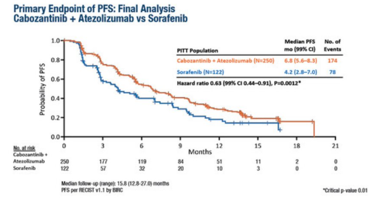 卡博替尼联合阿替利珠单抗作为晚期HCC的一线治疗,可相较于索拉非尼显著改善患者PFS。卡博替尼联合阿替利珠单抗的安全性是可控的,并且与每种药物的已知安全性一致。