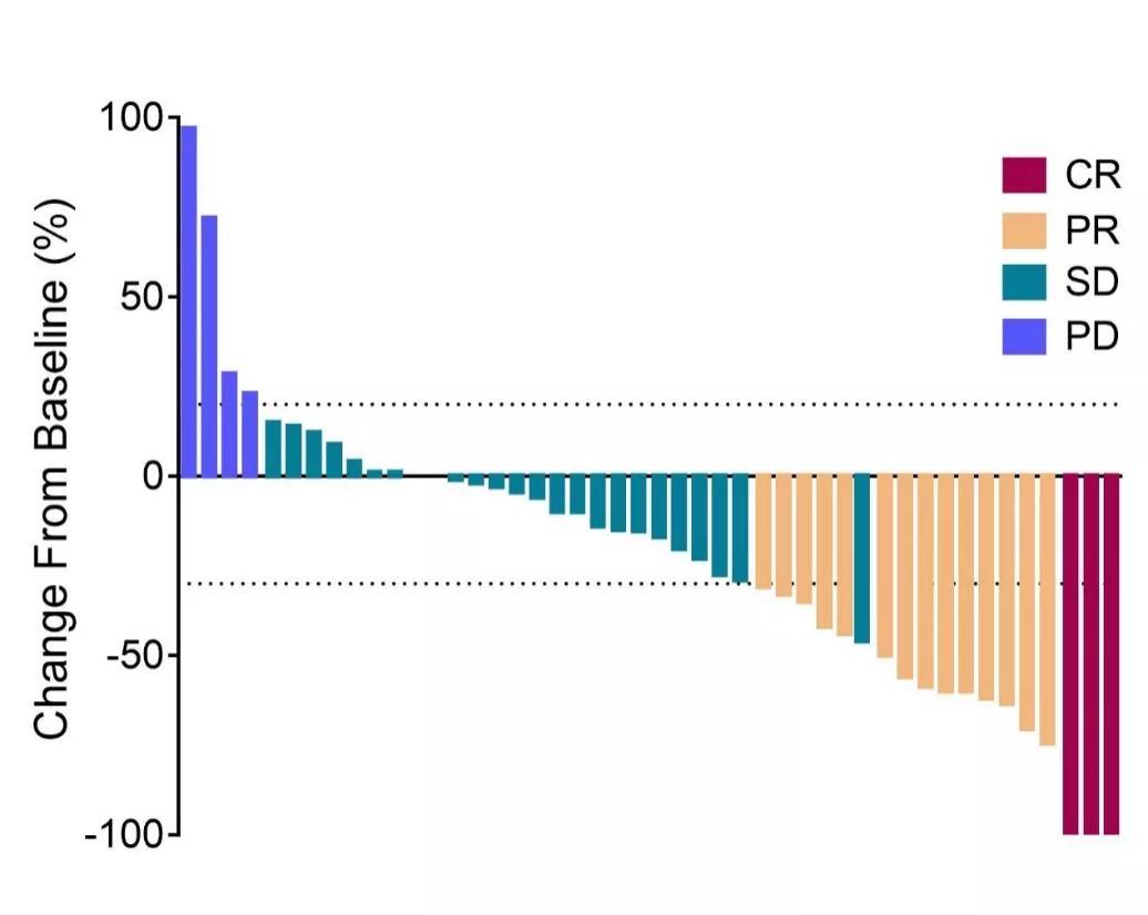 截至数据分析时间,共入组46例患者。46例患者中有17例(37.0%)在复发转移阶段接受了≥3线化疗,8名(17.4%)接受了抗PD-1/PD-L1抗体联合化疗的方案。目前ORR为37.0% (17/46),其中3名患者达到完全缓解(CR)。疾病控制率(DCR)为87.0%。生物标志物分析发现,肿瘤的PD-L1状态(CPS 评分)和既往全身治疗线数与ORR无关。