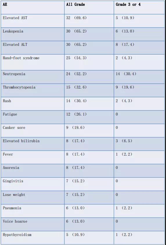 接受治疗的46例患者都出现了任何级别的治疗相关不良事件(TRAE),有37.0%的患者发生或出现了3级或4级TRAE。发生率较高的3级或4级TRAE是中性粒细胞减少症(30.4%)、血小板减少症(19.6%)、ALT升高(17.4%)、AST升高(10.9%)和白细胞减少(13.0%)。目前没有观察到与治疗相关的死亡。