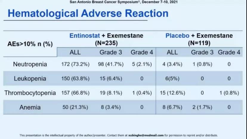 两组中最常见的3-4级不良事件分别为中性粒细胞减少(entinostat组103例/43.8%,安慰剂组1例/0.8%)、血小板减少(entinostat组20例/8.5%,安慰剂组1例/0.8%)和白细胞减少(entinostat组15例/6.4%,安慰剂组0)。entinostat组共发生28例严重不良事件(11.9%),安慰剂组共发生11例严重不良事件(9.2%)。
