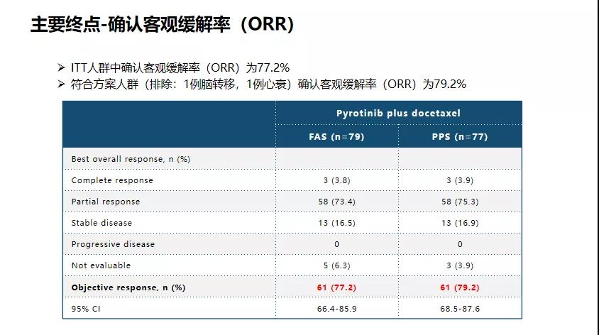 研究结果:研究主要终点客观缓解率(ORR)在ITT人群为77.2%,在符合方案人群中为79.2%,已非常接近CLEOPATRA研究中曲帕双靶一线治疗的客观缓解率,其中在早期曲妥珠单抗经治人群中(30.4%)客观缓解率可达83.3%。目前PFS数据尚不成熟。