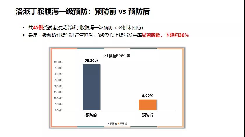 在安全性方面,常见的不良反应包括腹泻(62%),贫血(56.7%),白细胞下降(51.9%),中性粒细胞下降(41.8%)等;≥3级不良事件为中性粒细胞下降(29.1%),白细胞下降(27.8%),腹泻(21.5%)等。针对试验药物吡咯替尼所致腹泻及多西他赛所致中性粒细胞下降,本研究采用了洛哌丁胺进行腹泻一级预防及硫培非格司亭进行升白一级预防,在进行了一级预防后,≥3级腹泻发生率从38.2%降至8.9%,显著降低了腹泻发生率;≥3级中性粒细胞下降从36.1%降至23.3%,展示出一定下降趋势。