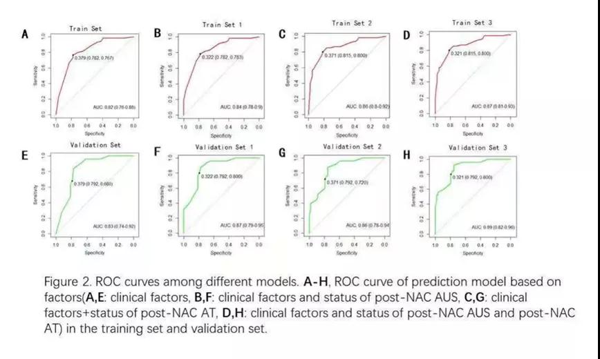 将NAC后AUS和AT的结果加入临床模型构建预测NSLN转移的临床影像模型,训练集中AUC为0.87(95%CI:0.81~0.93),验证集中AUC为0.89(95%CI:0.82~0.96)