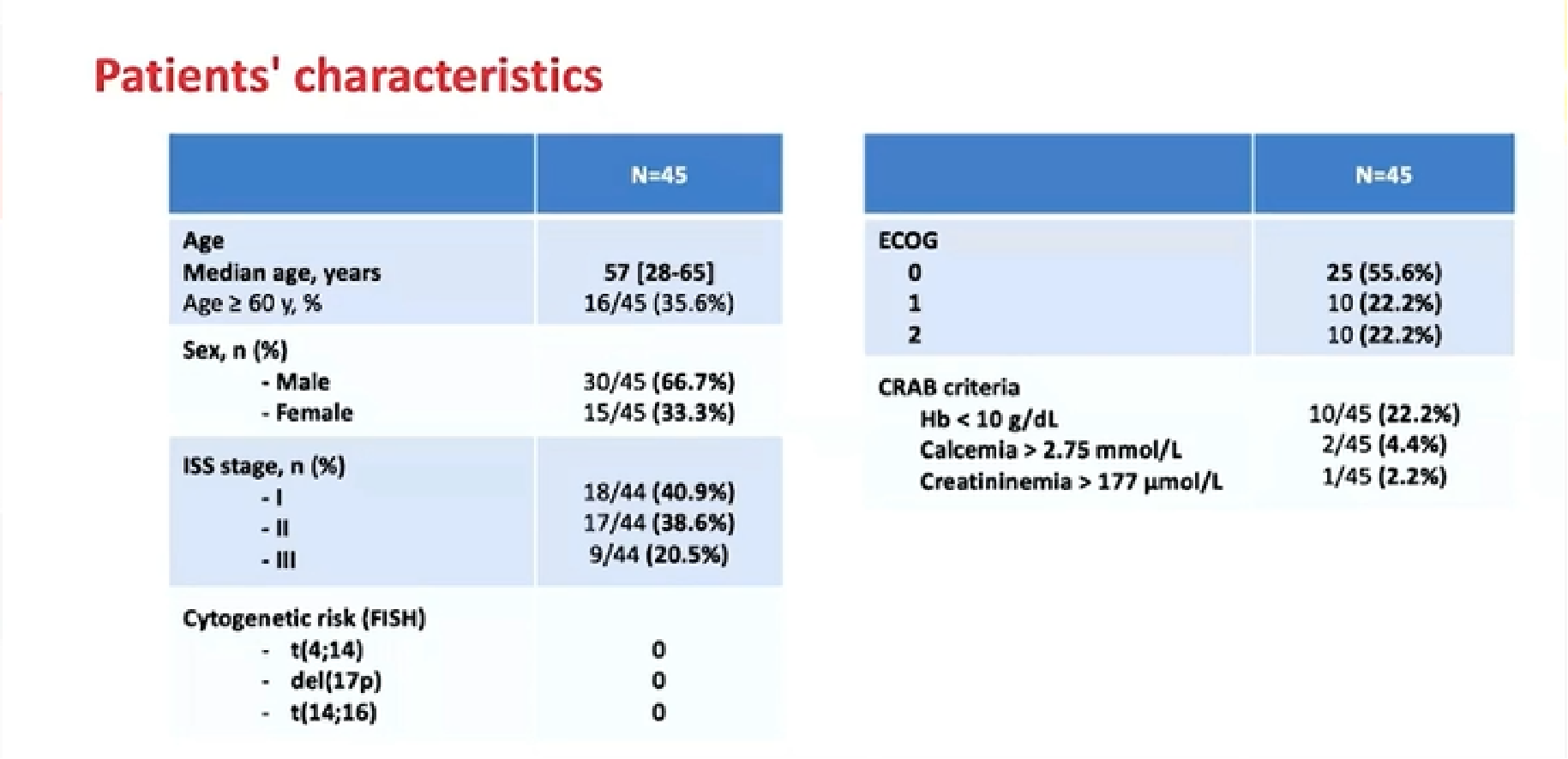 共有44名患者在2018年3月至2021年5月期间入选,其中28例患者首次复发,16例第二次复发。38名患者(86%)曾接触过硼替佐米,8名患者(18%)曾对来那度胺应答不佳。中位年龄为82岁(80-84岁)。所有患者都有虚弱评分≥2。在22名患者中,ISS为I期(n=5)、II期(n=10)或III期(n=7)。11例(32%)患者具有高风险细胞遗传学,包括t(4;14)(n=3)或del17p(n=8)。