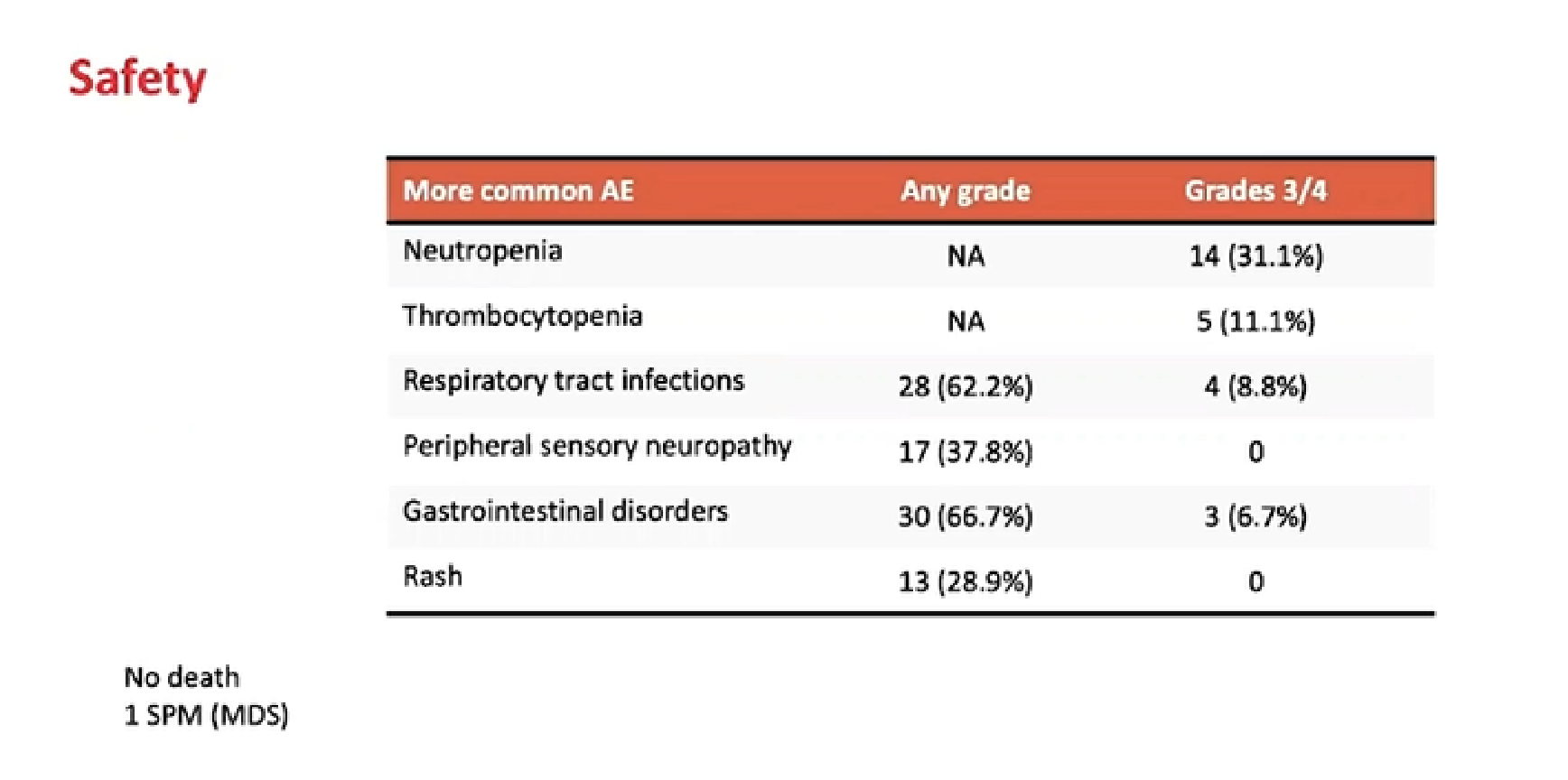 中位治疗时间是7个月,对比较脆弱的患者,两药联合还是可行的,整个有效性包括MR(微小缓解)以上的患者达86%,VGPR以上疗效的患者占33%。安全性方面也非常好,3级以上的不良反应占一半,主要常见的还是血液学毒性,包括血小板减少、粒细胞减少、感染等,不良事件的风险还是较低的。因此,针对老年脆弱患者,达雷木单抗联合伊沙佐米是非常可行的方案。