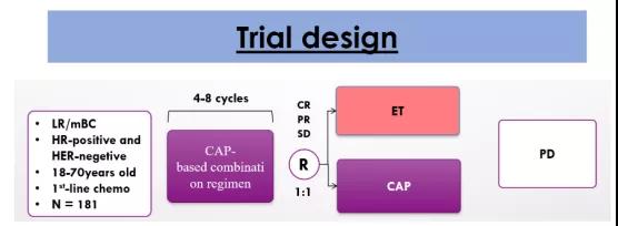 ■ 研究方法:HR+/HER2-转移性乳腺癌被纳入本研究。所有患者均经组织学证实并至少接受过4个周期的基于CAP的联合方案作为一线挽救性化疗。根据RECIST标准达到CR、PR或持续性SD的患者进入维持治疗设置(MT),并随机(1:1 比例)分配到CAP单药组或HT组。根据内分泌敏感或抵抗、内脏或非内脏转移进行集中随机化分层。主要终点是mPFS,次要终点是总生存期(OS)、安全性等。在接受至少过一种剂量维持治疗的所有患者中进行了优效性测试。最后一次随访于2021年6月30日结束,中位随访41.4个月,OS事件成熟。