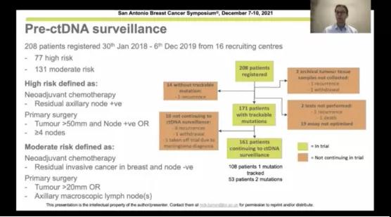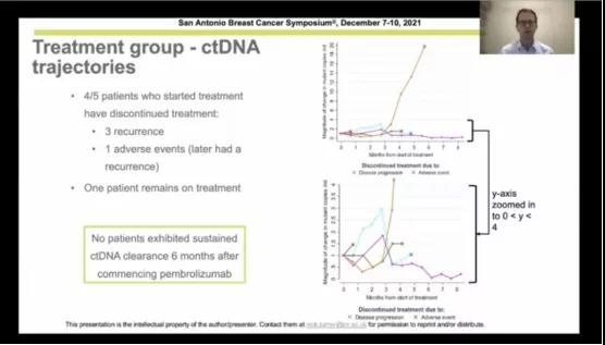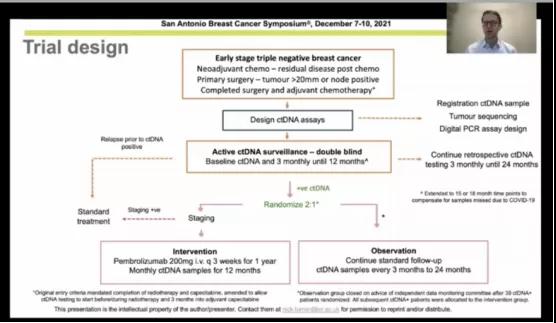 ■ 研究背景:在完成治疗后的早期三阴乳腺癌患者中检测出循环肿瘤DNA(circulating tumor DNA,ctDNA)提示未来的复发风险非常高。极早鉴定出高复发风险的人群以调整强化治疗可能延缓或预防肿瘤的复发。c-TRAK TN试验评估了前瞻性ctDNA监测在经治疗的三阴性乳腺癌病人的作用以及在检出ctDNA的病人中的帕博利珠单抗(PD-1单抗)的疗效。