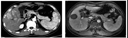 图1、病例54岁,肝右叶5.5×5.4cm肝癌(左图),行TACE+消融肿瘤完全坏死并缩小(右图),现患者已生存14年。
