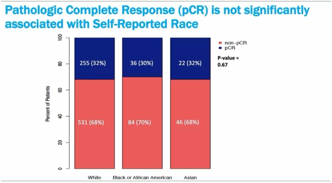 全球范围内乳腺癌死亡率存在种族差异,这种差异的实质原因并不清楚。I-SPY 2研究首次在入组总体人群中关注了种族因素对患者治疗结局及免疫基因特征的影响,结果显示:种族与分子分型和免疫特征基因表达的亚型无关,种族特征不影响患者的pCR率及无事件生存率,由此可以得出:既往I-SPY2研究被证明与pCR相关的亚型分布没有种族特异性。