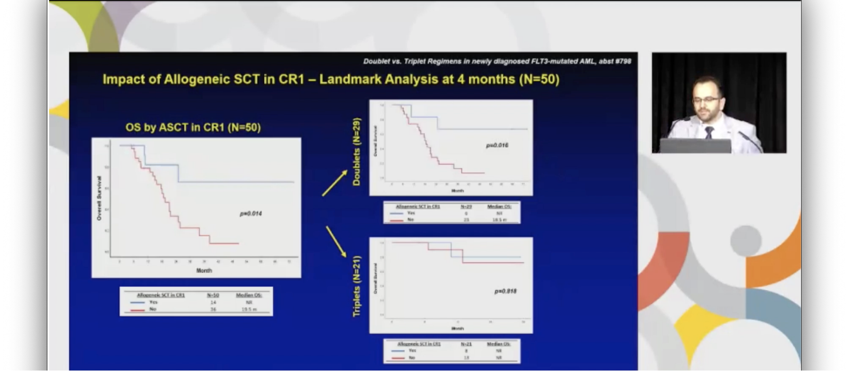 目前,国际上针对FIT3突变的不适合化疗或者老年AML患者的标准治疗方案是采用去甲基化药物联合FIT3抑制剂的两药联合方案治疗。Venetoclax是一种新的BCl-2抑制剂,对于FIT3基因突变或者其他的一些基因异常,甚至p53基因突变也有不错的疗效。第一项研究针对去甲基化药物联合Venetoclax及FIT3抑制剂组成的三药联合方案和标准方案的比较,主要应用的人群是老年和不适合化疗的 AML患者,且伴有FIT3突变的患者人群(大会摘要号:798)。