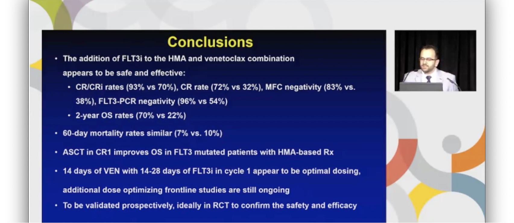 该项研究结果表明,一代、二代FIT3抑制剂的OS没有显著性差异;三药联合方案显著优于标准的两药联合,可进一步改善患者的CR/CRi率,提高MRD转阴率。该项研究为我们进行三药联合对照两药联合的前瞻性研究提供了非常好的工作基础。