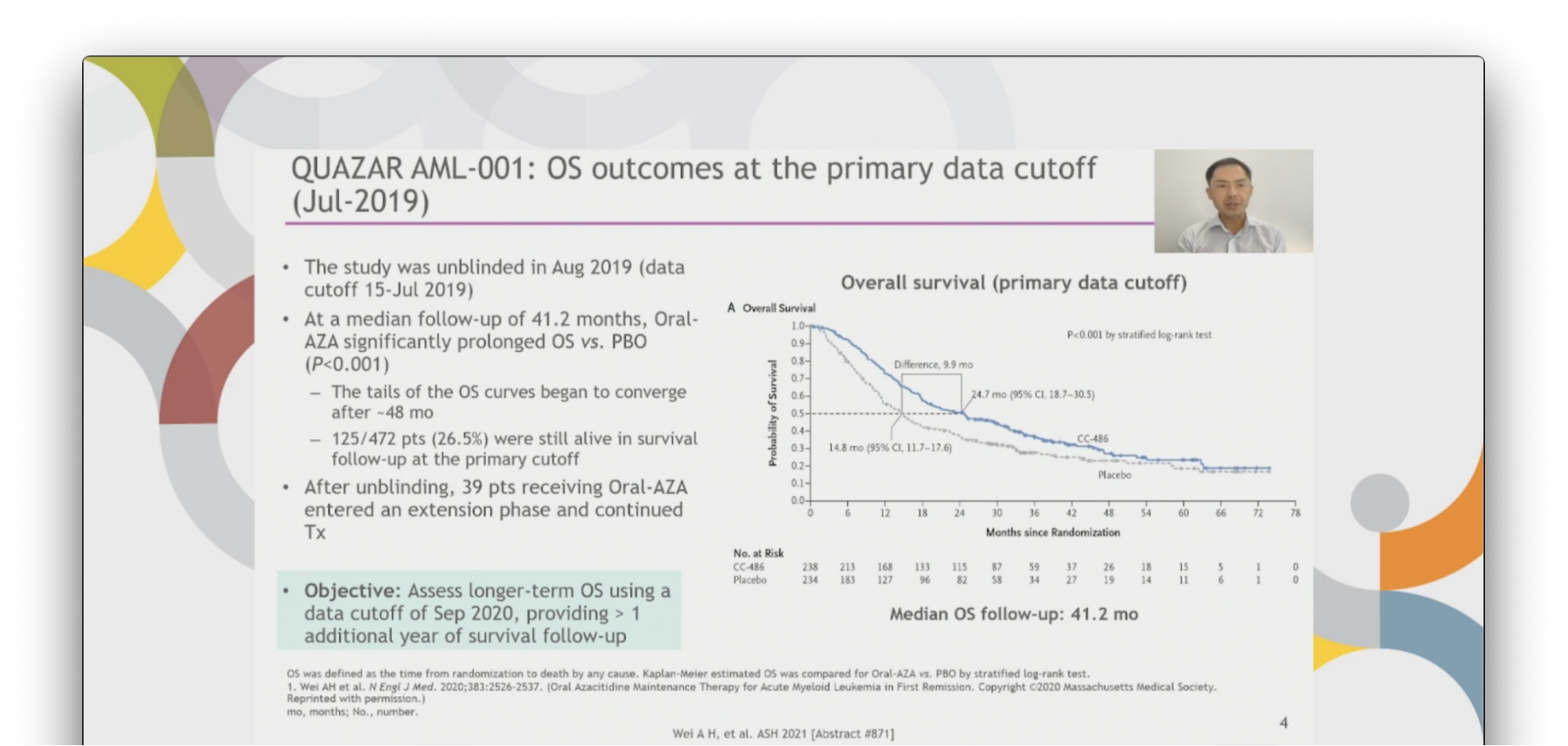 QUAZARAML-001是一项国际、多中心、前瞻性、随机对照临床研究,采用去甲基化药物(口服阿扎胞苷)对照安慰剂来观察在首次缓解的AML患者中的有效性。QUAZARAML-001的初步研究成果已经发表在去年的NEJM杂志上。研究公布首次数据的截止时间是2019年7月份,初步结果显示口服的阿扎胞苷组较安慰剂组有显著的生存优势(24.7 vs. 14.8个月)。