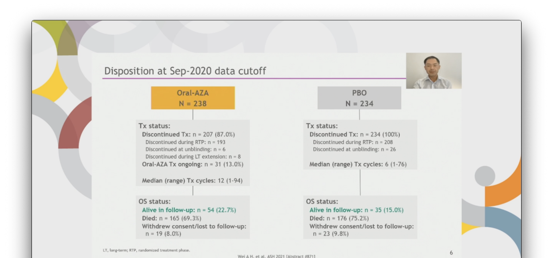 本届ASH年会上,该项研究报告了后续更新的数据(大会摘要号:871)。研究从2019年7月截至2020年9月份,观察了14个月的时间,入组的患者都是≥55岁新诊断、中高危的AML患者,通过诱导治疗以及巩固治疗,能够达到CR/CRi,经过四个月的持续CR/CRi,对患者进行了1:1的随机分组,治疗组是口服阿扎胞苷(300mg),安慰剂组作为对照。治疗时间每个周期是14-28天。