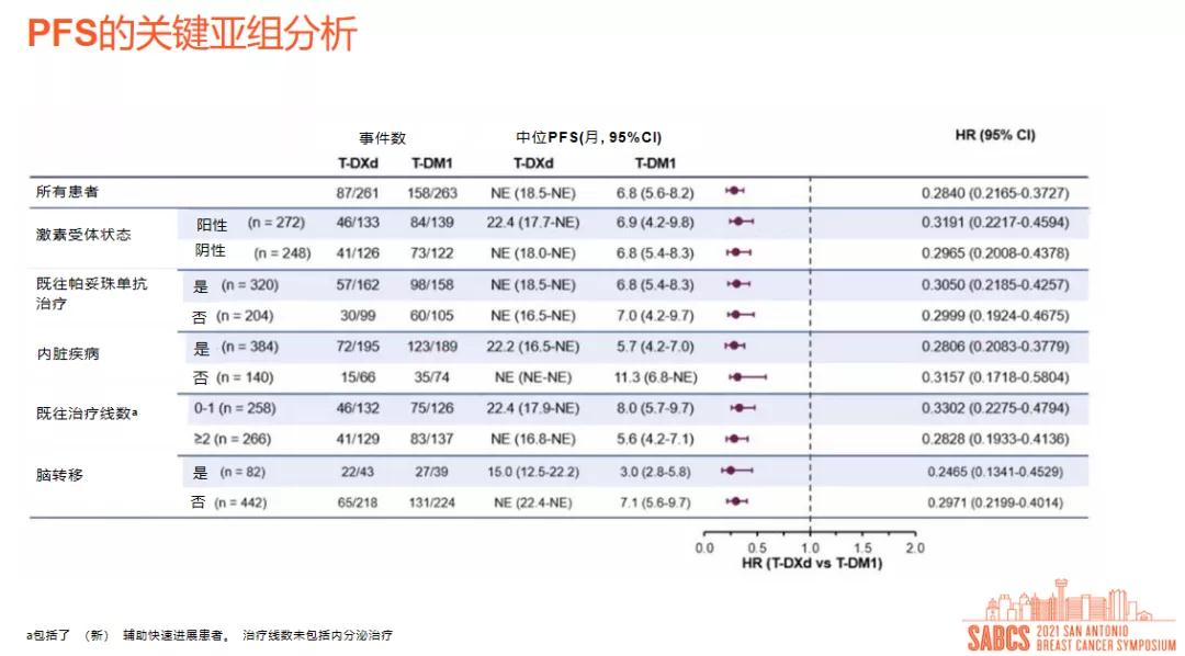 本次SABCS大会报道了该研究的亚组数据。如下图所示,HR状态(阴性或阳性)、是否既往帕妥珠单抗治疗、是否内脏转移、既往治疗线数(0-1或≥2)、是否脑转移等各亚组的PFS和ORR获益趋势一致。