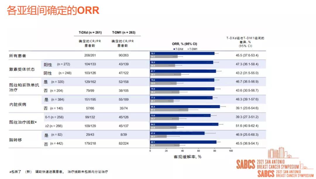 2021 ESMO大会报道了DB-03研究T-DXd的非常惊艳的PFS数据,与T-DM1相比,研究者评估的PFS分别为25.1个月和7.2个月,BICR评估的T-DXd组mPFS尚未达到,ORR也有获益。今年SABCS进一步公布了DB-03研究的亚组分析结果。各个亚组(包括BM患者)中,T-DXd 相比T-DM1存在一致的PFS和ORR显著获益,与既往结果一致,包括HR状态、既往是否接受过曲帕双靶治疗、不同的治疗线数、内脏转移状态或者基线脑转移状态。
