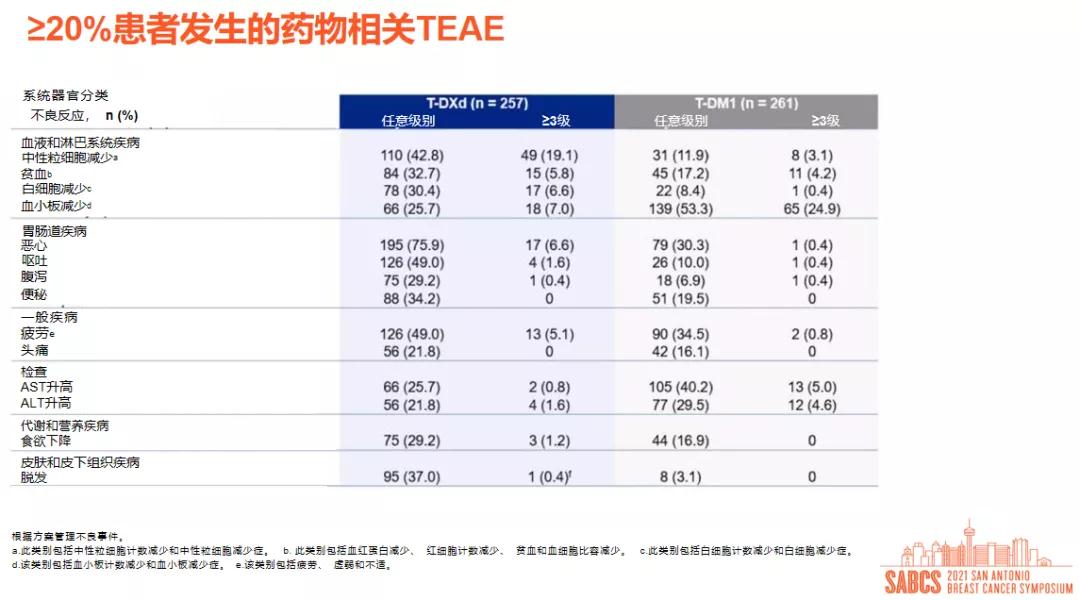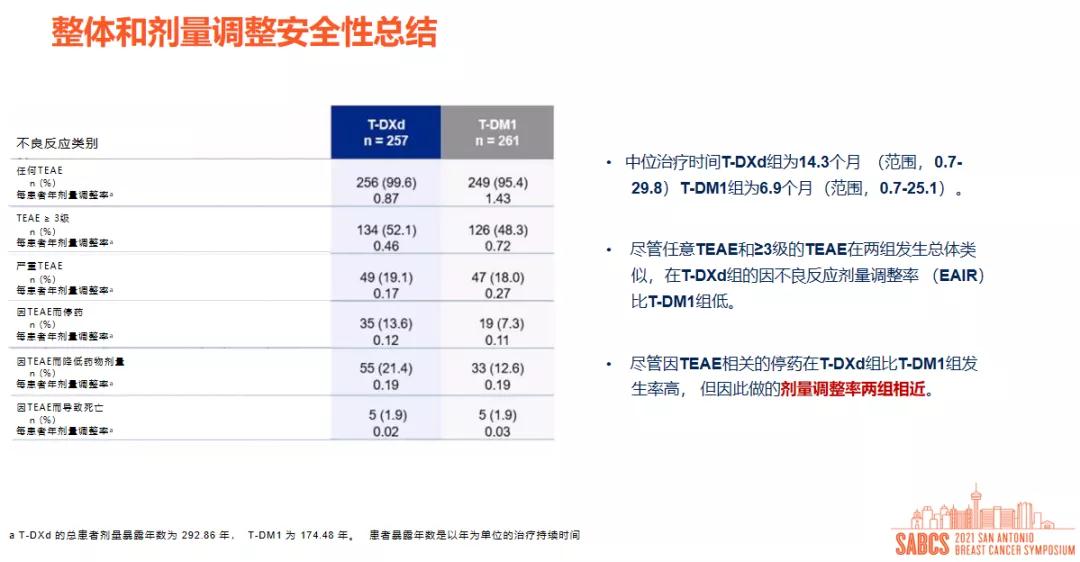 T-DXd组和T-DM1组的中位治疗时间分别为14.3个月 (范围:0.7~29.8)6.9个月(0.7~25.1)。尽管两组患者的任意TEAE(99.6% vs 95.4%)和≥3级TEAE(52.1% vs 48.3%)发生率相似,但T-DXd组的每患者年剂量调整率(EAIR)低于T-DM1组(任意TEAE:0.87 vs 1.43;≥3级TEAE:0.46 vs 0.72);T-DXd组的停药率高于T-DM1组(13.6% vs 7.3%),但因此做出的剂量调整率相近(0.12 vs 0.11)。此外,没有观察到4级或5级的T-DXd相关ILD/肺炎事件,ILD/肺炎事件发生率在总人群、亚洲与非亚洲人群之间是近似的。