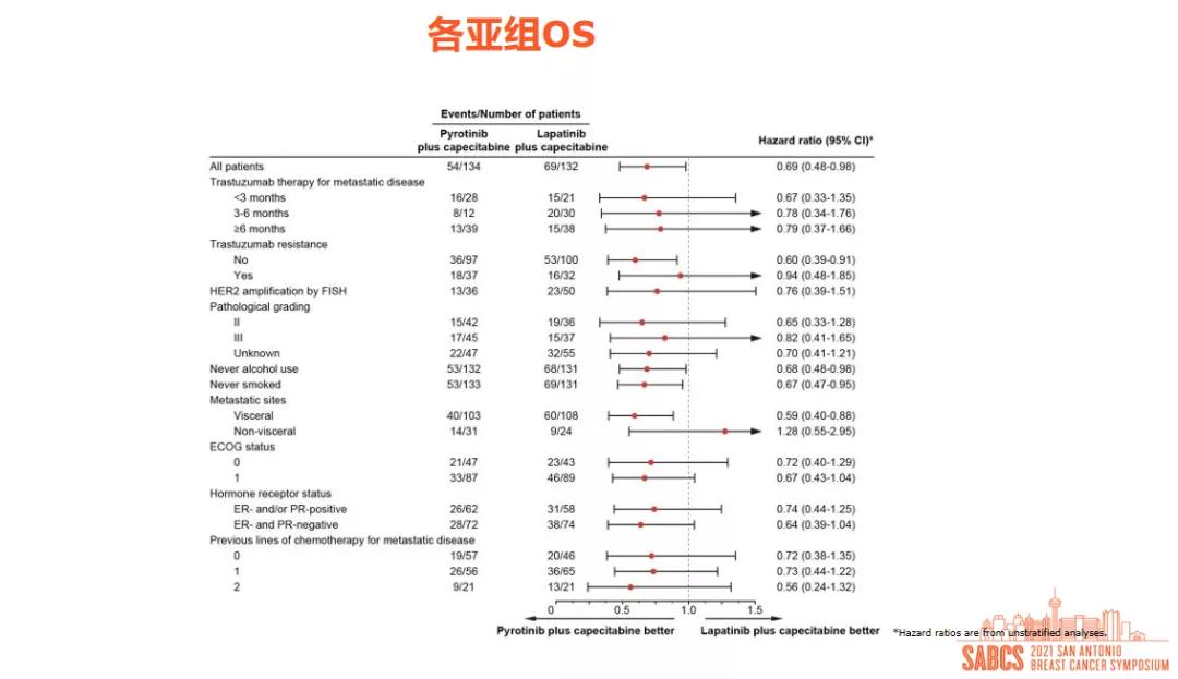 本次SABCS大会报告了该研究的OS数据。至数据截止日期2021年3月31日,吡咯替尼组和拉帕替尼组的中位OS分别为NA和26.9个月(HR 0.69,95%CI:0.48~0.98,P=0.02),2年OS率分别为66.6%和58.8%。亚组分析显示各亚组的获益趋势一致。但无曲妥珠单抗耐药(HR 0.60)患者获益更显著,而既往0线(HR 0.72)、1线(0.73)、2线(0.56)治疗患者的获益趋势一致。