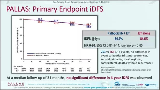在2021 SABCS中报道了PALLAS研究随访31个月的最终iDFS结果(GS1-07:Ⅱ-Ⅲ期HR+/HER2-乳腺癌完成既往手术后,随机接受Palbociclib+内分泌治疗或单纯内分泌治疗,主要研究终点为iDFS。该研究不强制进行Ki67评估)。结果显示,主要终点未达到,iDFS无显著获益,4年iDFS在Palbociclib+内分泌组和单纯内分泌组分别为84.2%和84.5%(图1),无绝对获益。该研究结果同步发表在JCO。(J Clin Oncol. 2021 Dec 7;JCO2102554.)