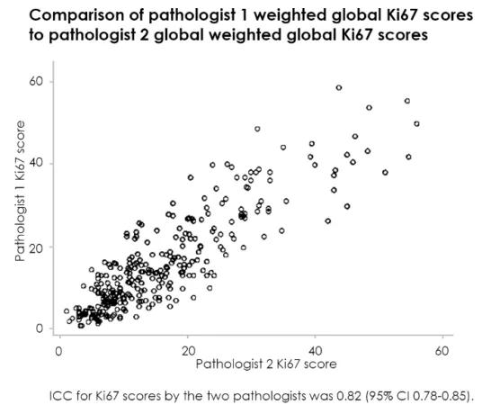 2021 SABCS上有2项壁报评估HR+/HER2-患者Ki-67与复发评分(Recurrence scores,RS)相关性,一项来自KPNC(Kaiser Permanente Northern California)的研究纳入307例患者(P1-08-10)和1项来自加拿大的研究纳入606例患者(P1-08-01)。研究显示不同的病理医生对同一患者Ki-67的评估具有偏差(图9);2项研究均尝试应用图像自动分析系统检测Ki-67,结果显示与病理医生评估的一致性较高(图10)。