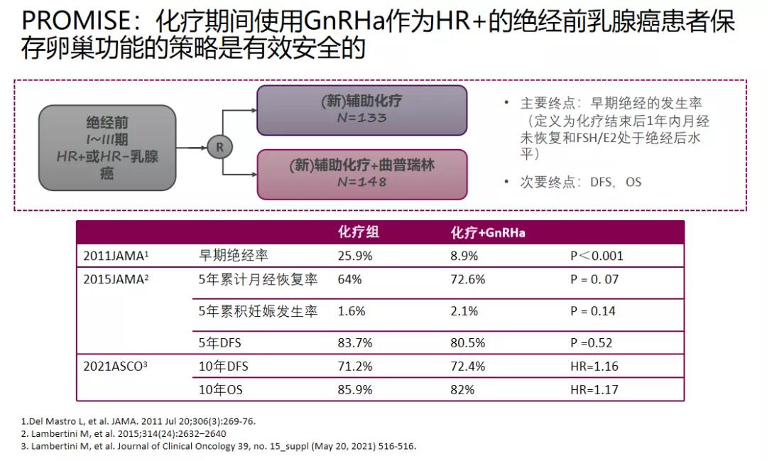 第二项临床研究也是大家非常熟知的PROMISE研究,这项临床研究纳入了HR阳性或阴性的绝经前患者,结果显示化疗+GnRHa组患者的早期绝经率比化疗组有明显减少,分别为25.9%和8.9%,差异具有统计学差异,对患者的远期生存也没有产生负面的影响。