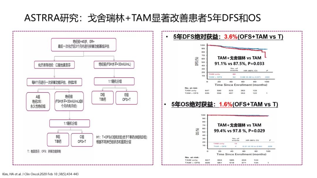 张剑教授:新版共识是在旧版共识的基础上做了一些变化。旧版共识认为,低危的绝经前患者可以单纯使用三苯氧胺,而中高危患者推荐在OFS的基础上联合三苯氧胺(TAM)或芳香化酶抑制剂 (AI) 。新版共识根据ASTRRA临床研究结果增加了适应症群体。该研究表明,45岁以下的ER+绝经前患者在经过化疗+TAM治疗2年后,仍有95%的患者恢复月经。对于此类患者,在TAM基础上联合戈舍瑞林可以使5年DFS率提高3.6%(91.1% vs 87.5%),5年OS率提高1.6%(99.4% vs 97.8%)。
