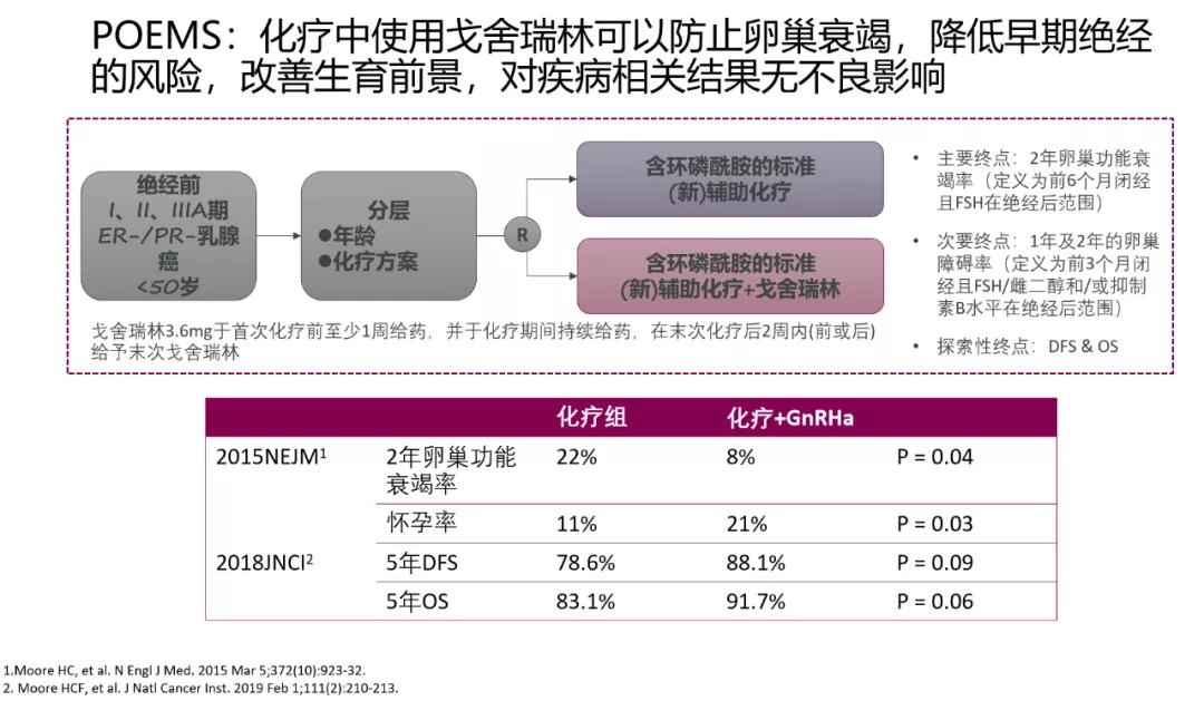 目前,卵巢保护相关研究都是在单月剂型中开展的,积累的循证医学证据更多;3月剂型GnRHa能否与短周期化疗(如4个周期的TC方案)联合,也需要进一步的临床研究来证实,对间接比较的研究结果应谨慎解读。