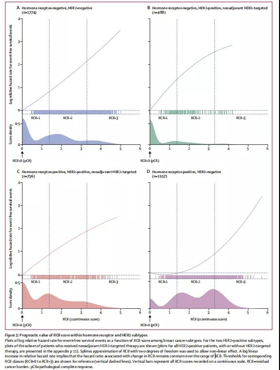 RCB每增加一个单位,相关的单变量复发/死亡危险比(HR)均有增加:HR+/HER2-患者增加1.55倍(95% CI:1.41~1.71);HR-/HER2+患者增加2.16倍(95% CI:1.79~2.61)(无论有无HER2靶向治疗;所有亚型P<0.0001)。