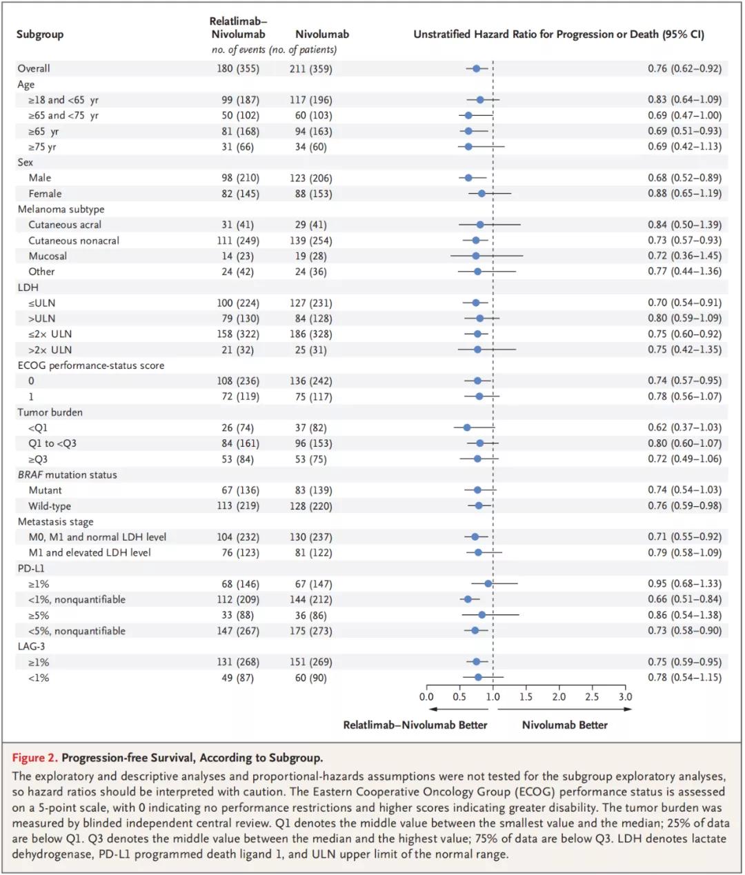 预先指定的探索性分析中,关键亚组PFS也更倾向于Relatlimab联合Nivolumab治疗组,而非Nivolumab单药组(图2)。