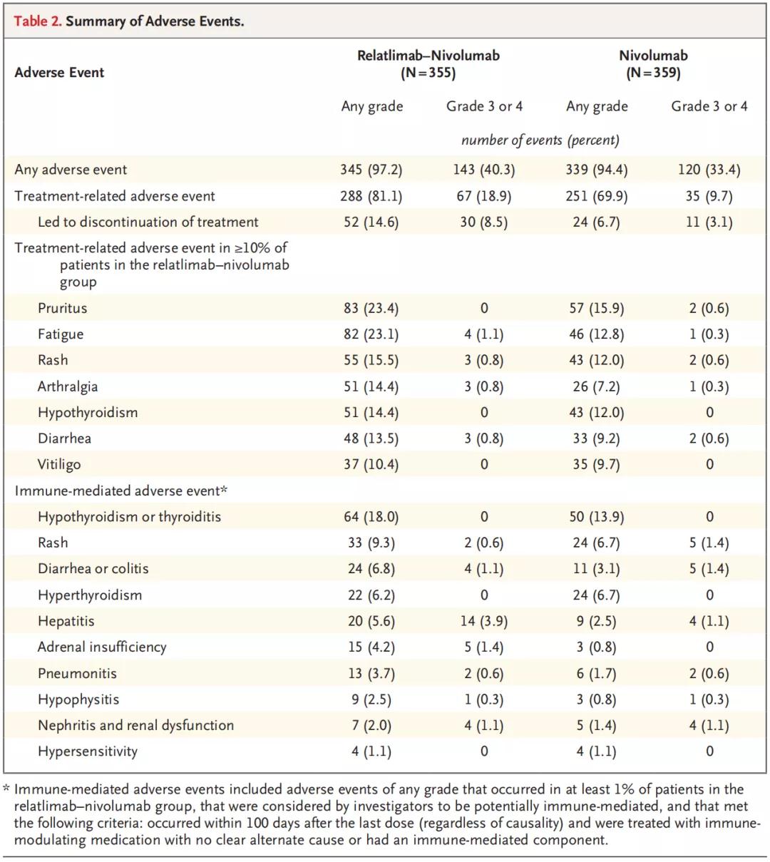 Relatlimab联合Nivolumab组最常见的免疫治疗相关不良事件为甲状腺功能减退或甲状腺炎(18.0%)、皮疹(9.3%)和腹泻或结肠炎(6.8%)。