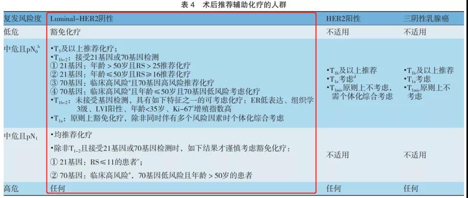 绝经后高危患者仍需要进行辅助化疗,而低危患者可豁免化疗;对于中危患者,要根据淋巴结状态,ER表达,年龄,ki67状况等临床病理因素,结合基因检测结果,评估风险决定是否豁免化疗。