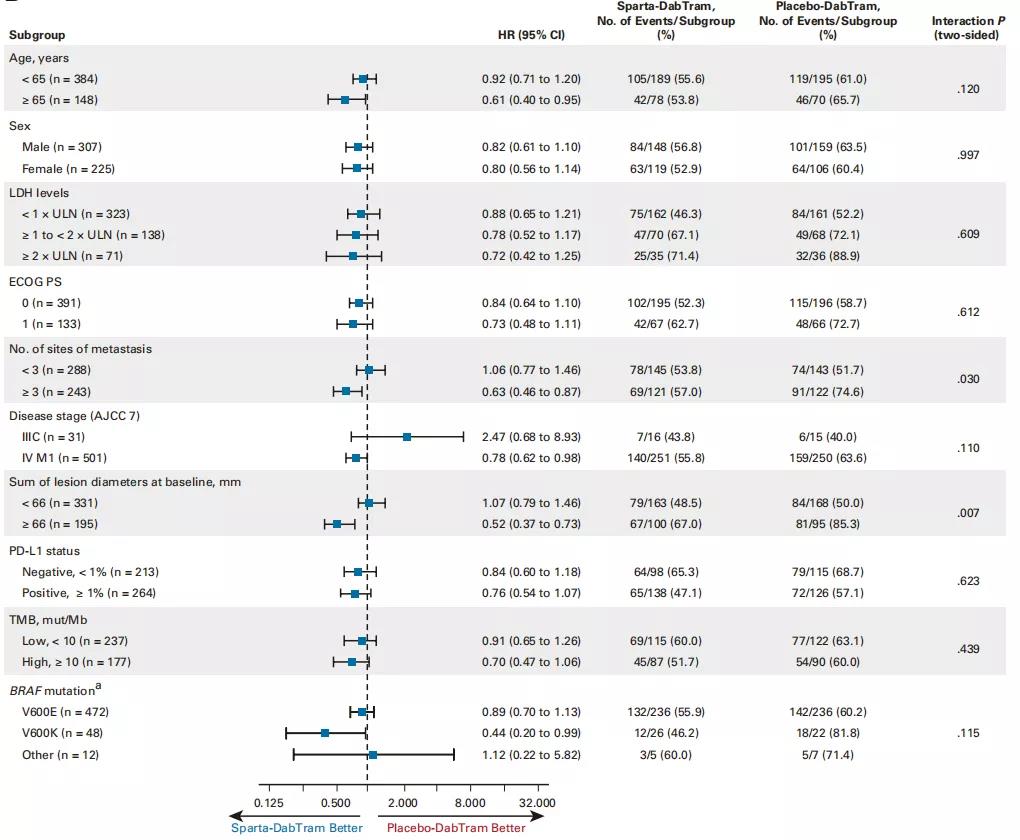 研究结论认为,该研究未达到其主要终点;这些结果不支持使用sparta-DabTram一线治疗。进一步的生物标志物驱动研究可能会确定可以从检查点抑制剂联合靶向治疗中获益的患者亚群。