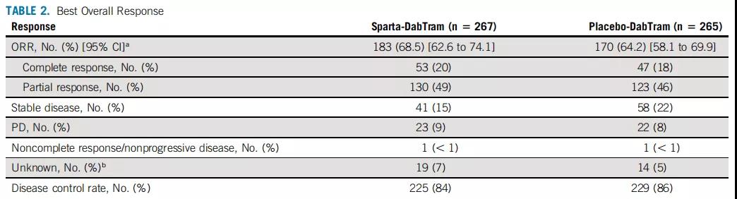 sparta-DabTram组和安慰剂-DabTram组的ORR分别为69%(183/267)和64%(170/265),CR率分别为20%(53/267)和18%(47/265),中位DOR分别为未到达和20.7个月,2年DOR率分别为55%和48%。