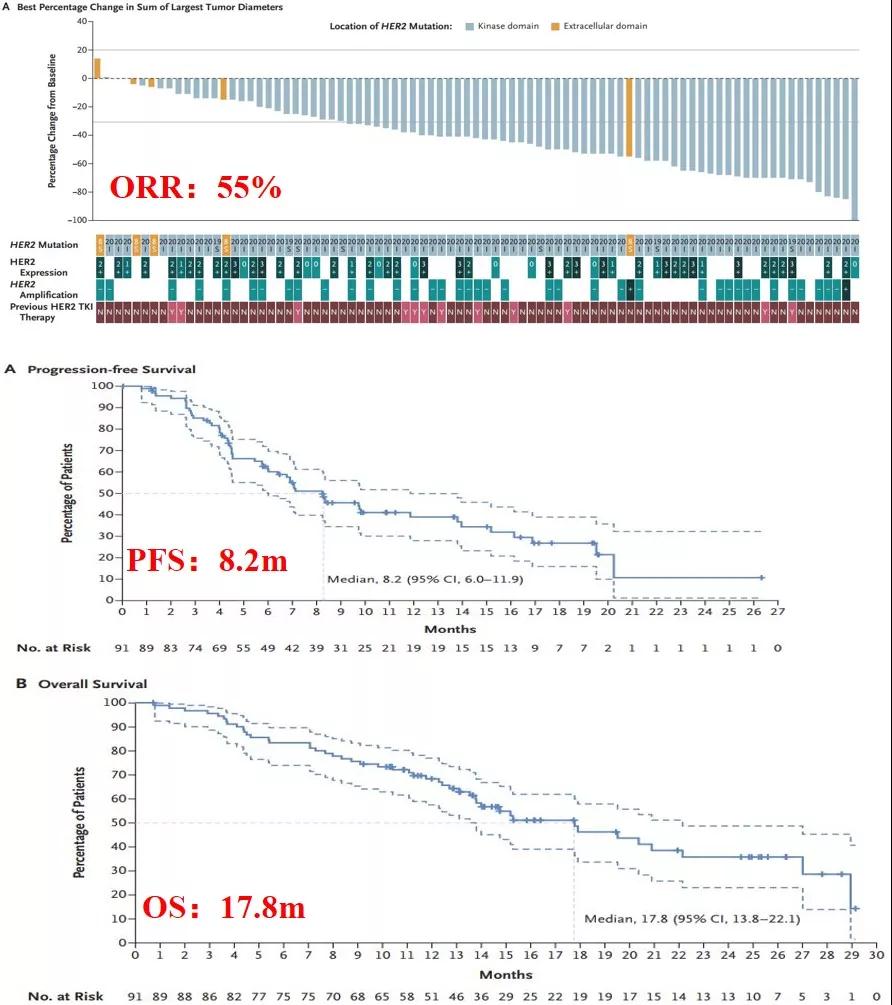 DS-8201是治疗HER-2突变NSCLC患者的代表性药物,相关研究数据已经于《新英格兰医学杂志》发表。在这项多中心、开放标签、双队列、II期临床研究中,91例HER-2突变的非小细胞肺癌患者,突变类型包括扩增、蛋白过表达、点突变及插入。无症状的脑转移或未接受糖皮质激素治疗的脑转移患者允许入组,DS-8201的治疗剂量为6.4mg/kg,三周一次。研究中,95%的患者既往接受过含铂双药化疗,66%的患者既往接受过针对PD-1或PD-L1的免疫检查点抑制剂治疗,均为重度治疗的患者。分别有93%和7%的患者突变位于酪氨酸激酶域以及细胞外。
