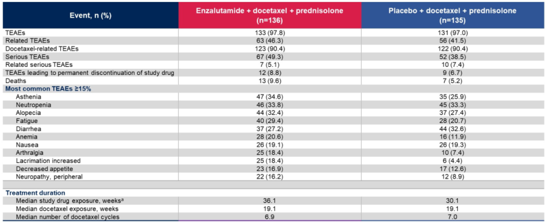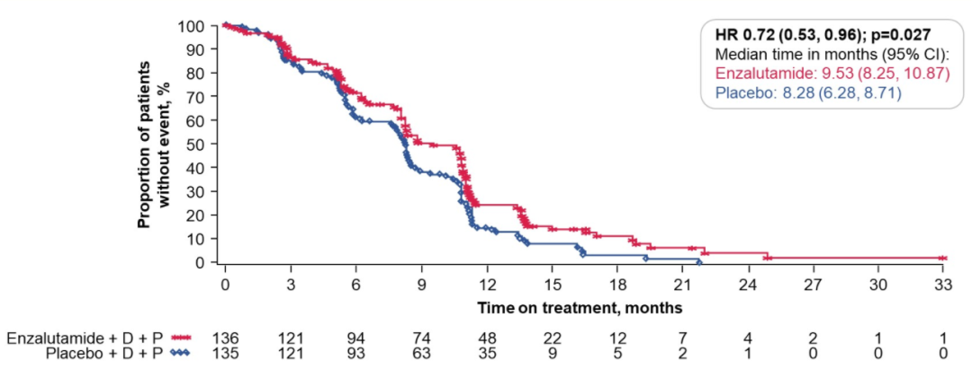 研究结果显示,相较于安慰剂+化疗组,恩扎卢胺+化疗组的中位PFS(9.53 vs 8.28个月)、TTPP(8.44 vs. 6.24个月,HR 0.58;95%CI:0.41~0.82;P=0.002)、PSA缓解率(55.9% vs 37.0%)等均有改善。我们比较关注的另一个方面是联合治疗会不会增加毒副作用,研究结果显示联合方案的安全性良好,恩扎卢胺组和安慰剂组的3/4级TEAE(61.8% vs 62.2%)、停药率(8.8% vs 6.7%)基本相似。该研究表明,恩扎卢胺等NHT可以作为mCRPC治疗的基石,贯穿患者的全程管理,疗效和安全性值得肯定。