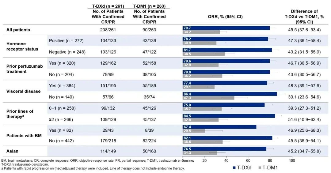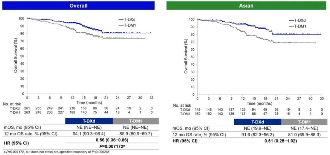 在次要终点方面,亚洲人群T-DXd组和T-DM1组由研究者评估的中位PFS分别为25.1和7.0个月,与BICR结果相似,研究者评估T-DXd治疗的进展或死亡风险可降低74%(HR 0.26,95%CI:0.19~0.37)。亚洲人群的OS同样尚未成熟,两组患者的中位OS均为未达到,但已经可以看到T-DXd组的获益趋势,HR为0.51(95%CI:0.25~1.02)。在ORR方面,亚洲人群T-DXd组和T-DM1组的ORR分别为76.5%和31.3%,实际上T-DM1组的ORR已经很优秀了,而T-DXd组可使ORR提高一倍多,两组间的ORR差异达到了45.2%(95%CI:34.7~55.8%)。