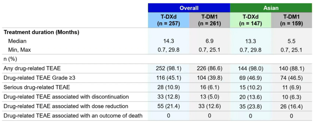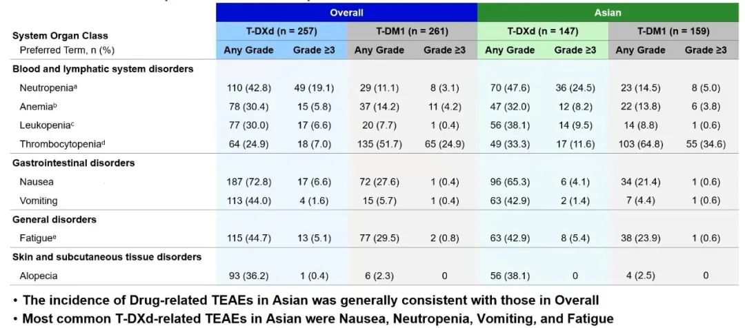在不良事件谱方面,和全球人群一样,亚洲人群T-DXd治疗常见(≥30%)的任何级别TEAE是:恶心(T-DXd和T-DM1:65.3%vs 21.4%)、中性粒细胞减少(47.6%vs 14.5%)、呕吐(42.9%vs 4.4%)、乏力(42.9%vs 23.9%)等。